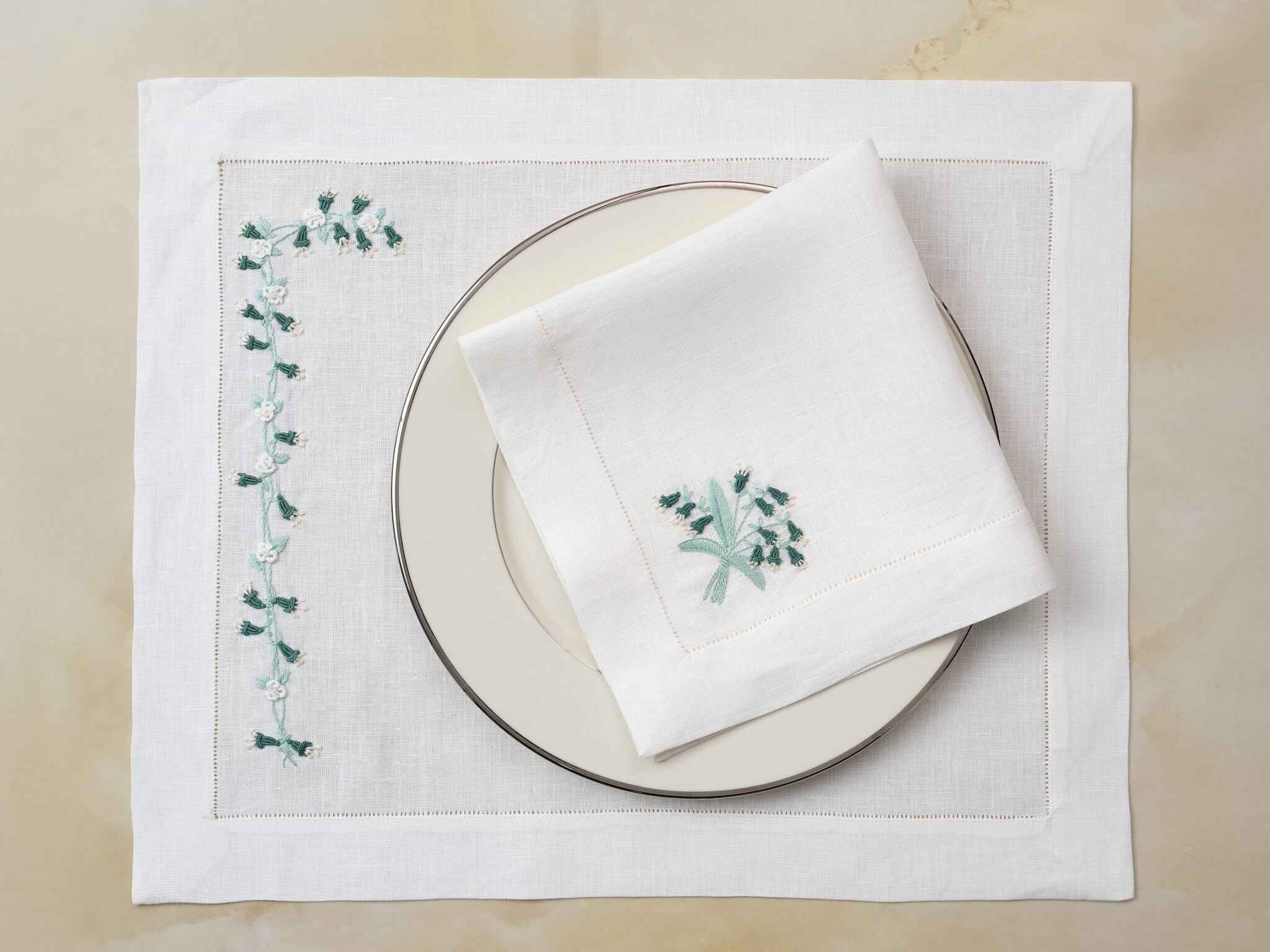 Native to the cool highlands of South America, Lady’s Eardrops — the fuchsia flower — has enchanted gardeners and artists alike with its pendulous blossoms and vivid hues. This heritage of elegance is translated into hand embroidery: the placemat carries the motif on one corner, while the napkin mirrors it with the same refined finish. Each stitch recalls the flower’s journey from distant landscapes to timeless linen.