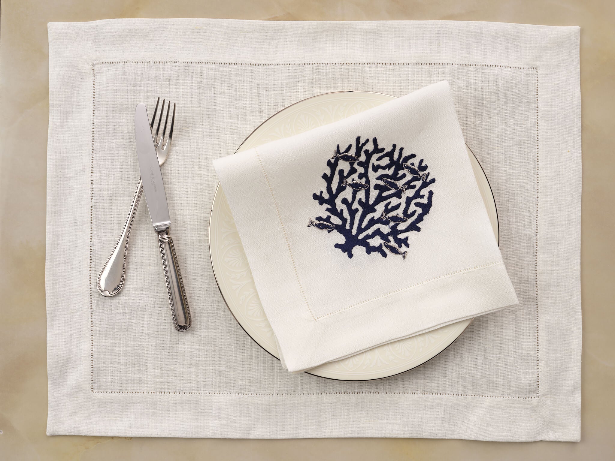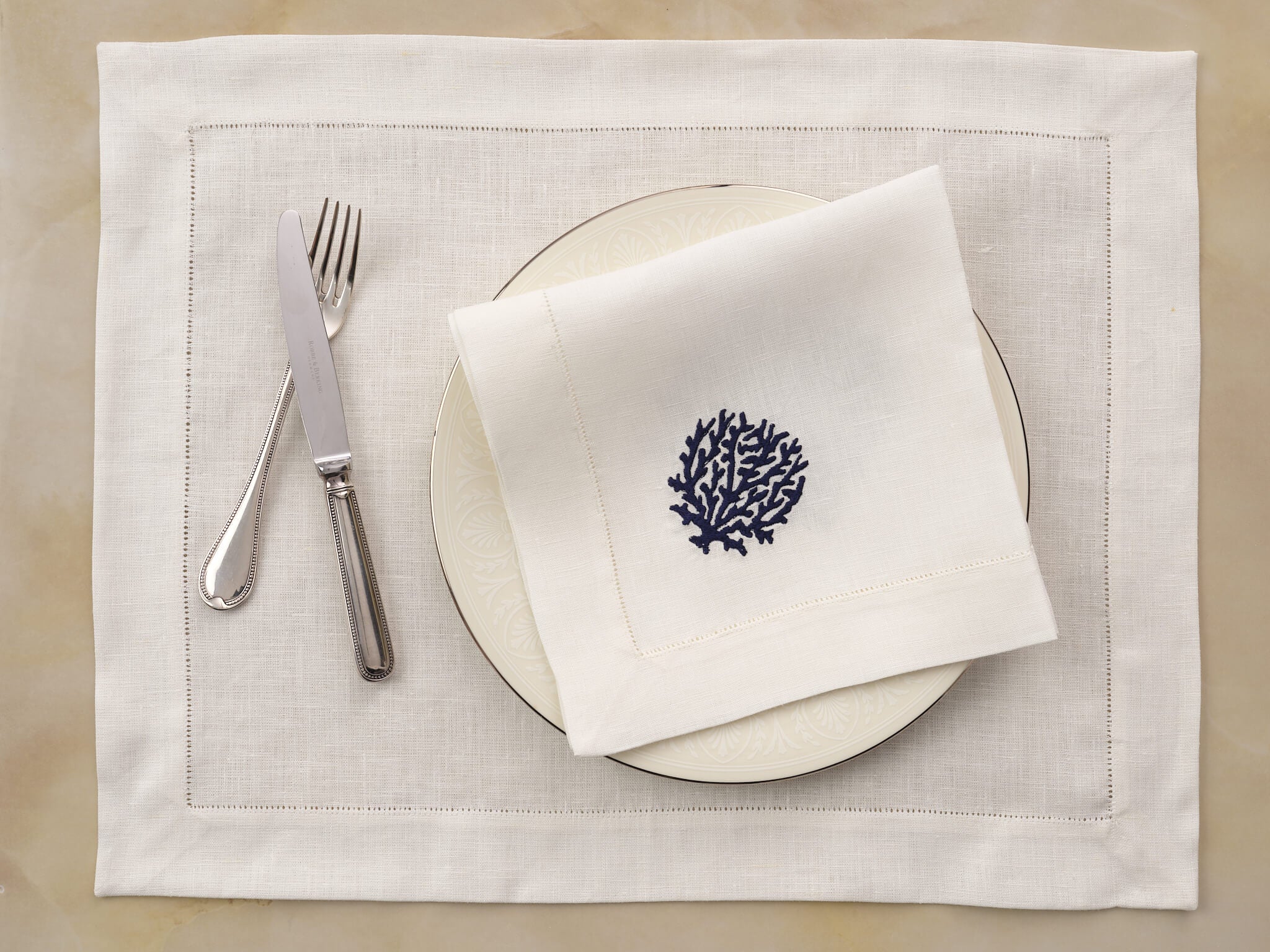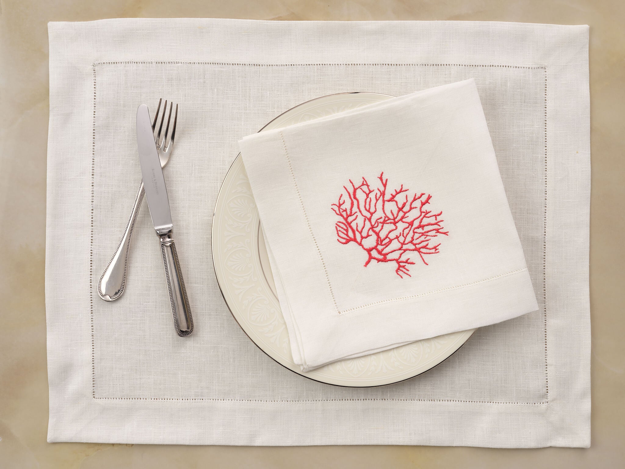A chic linen napkin adorned with elegant coral-inspired embroidery — refined, stylish, and perfect for a sophisticated table setting. Crafted using machine embroidery for a clean, contemporary finish.