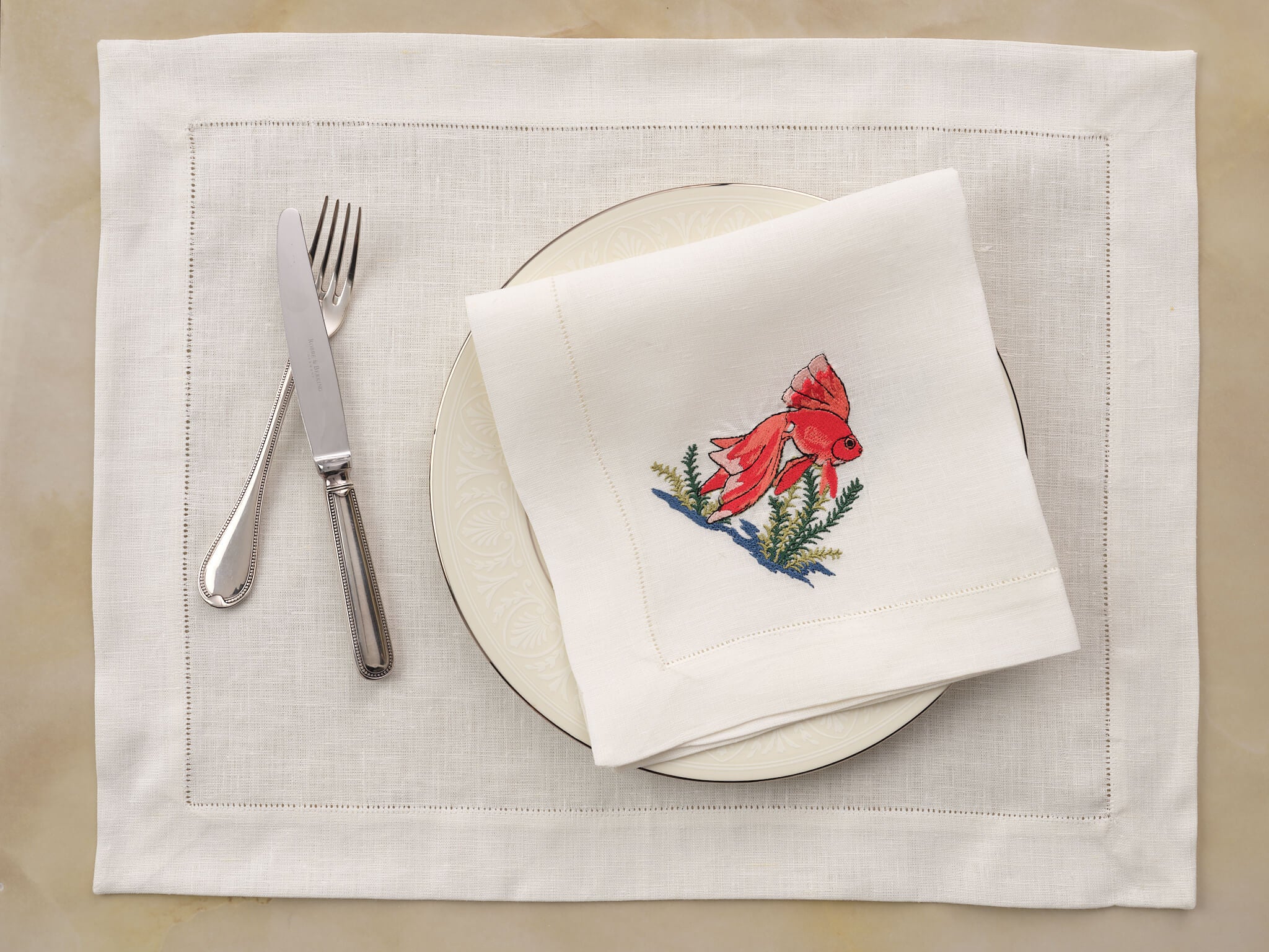 Linen napkin featuring contemporary fish embroidery, inspired by the sea. Stylish, refined, and effortlessly chic, Pisces brings a modern coastal touch to any table setting.