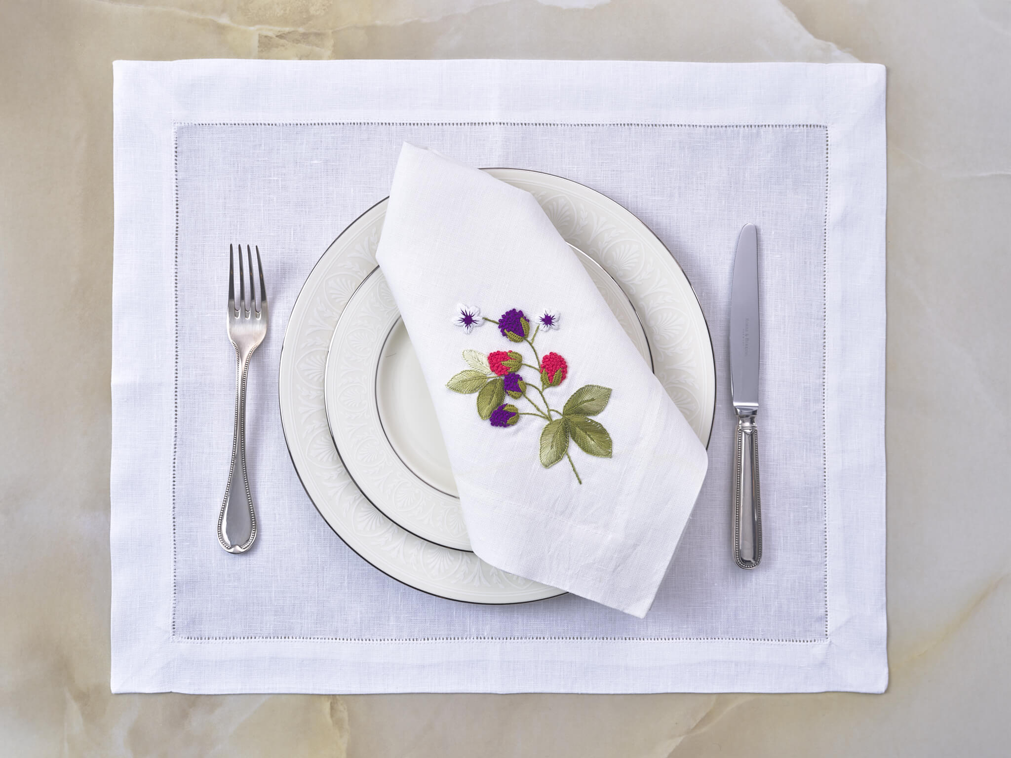 Hand-embroidered with a cluster of red and blue berries, this napkin brings a fresh and playful touch to pure linen. The motif is stitched on one corner with refined detail, while mitered corners and a 4 cm hemstitched edge complete the design with artisanal elegance.