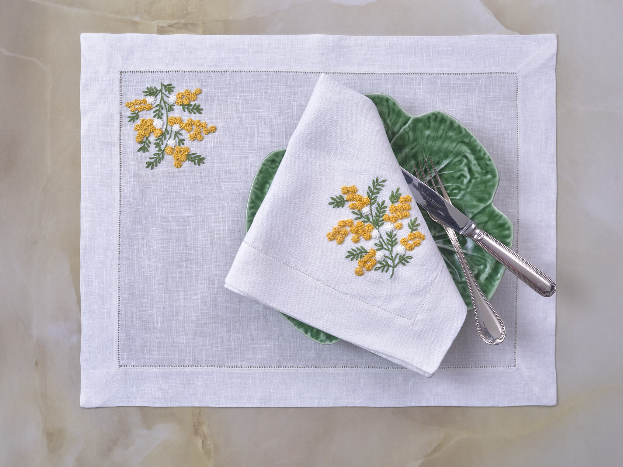 Bathed in the light of the Mediterranean, the mimosa has become a symbol of femininity, sensitivity, and enduring friendship. Its golden blossoms, celebrated each spring along the Riviera, are delicately hand-embroidered on one corner of the placemat, with the napkin echoing the motif in the same refined finish. The embroidery captures the flower’s airy clusters, bringing warmth and brightness to pure linen.