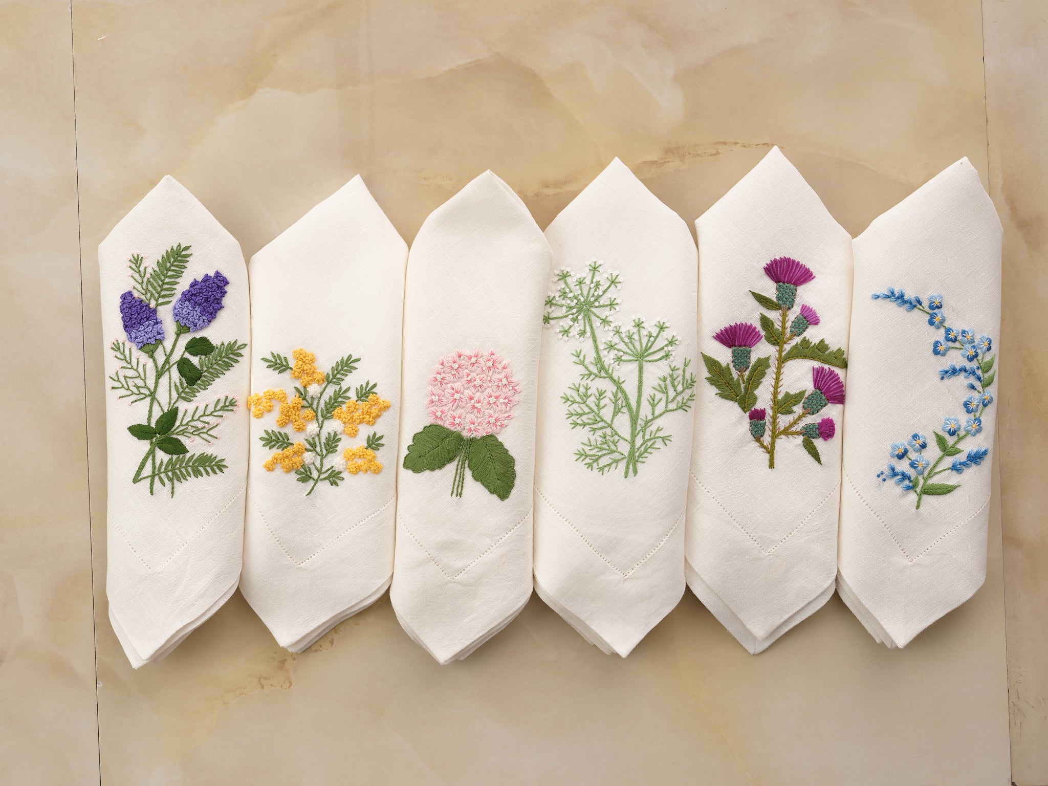 A refined set of six linen napkins featuring meticulously hand-embroidered flowers, exceptional craftsmanship and truly elevated artistry.